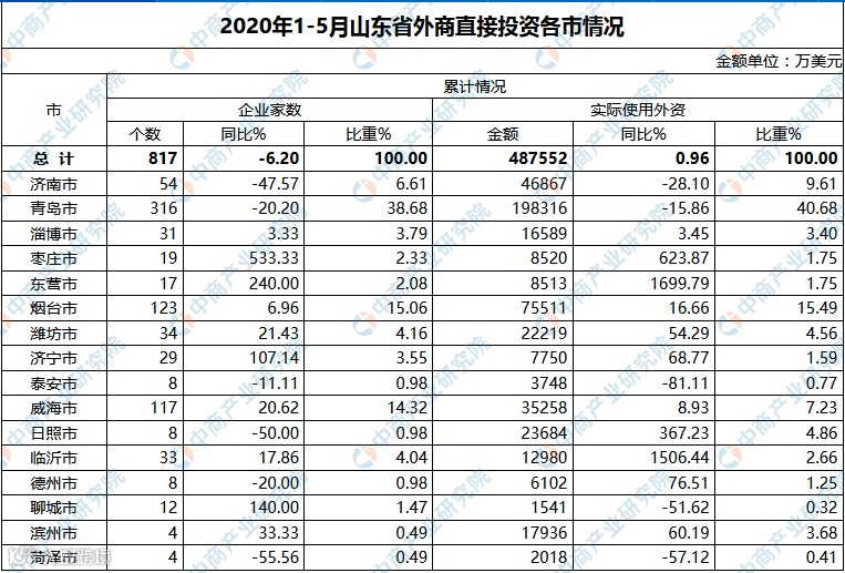 2020年1-5月,山东省新设外商投资企业817家,实际使用外资48.8亿美元,同比增长1%,高于全国增幅7.2个百分点。5月当月,山东省新设外商投资企业238家,实际使用外资11.1亿美元,同比增长2.7%。