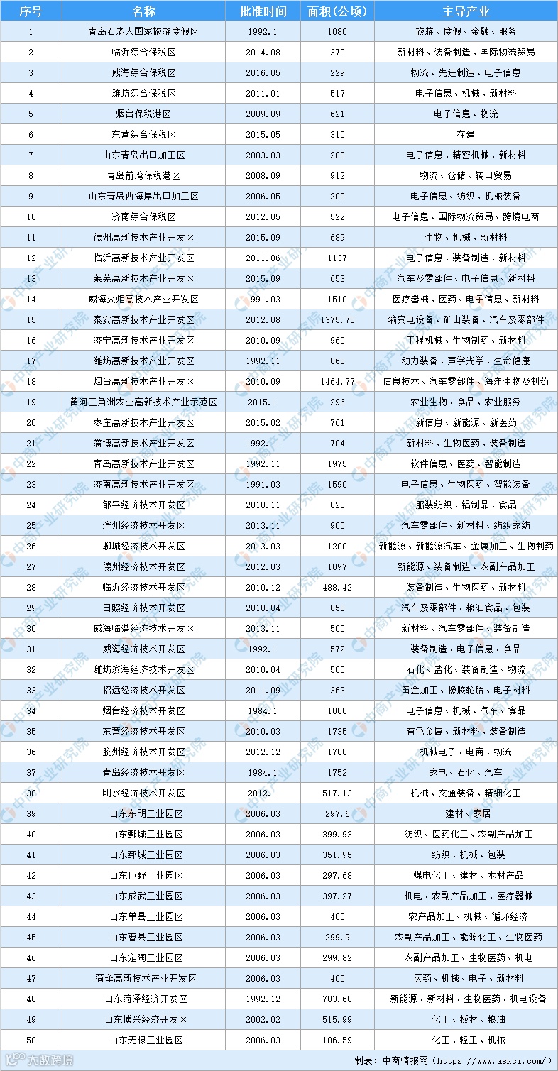 2020年山东省开发区汇总一览表