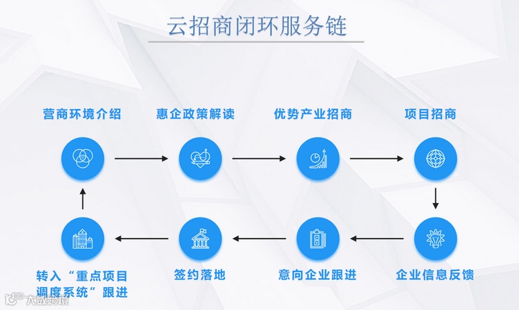 各市通过介绍营商环境、解读惠企政策,展现产业优势,发布优质项目进行精准招商,意向客商根据意向提交反馈信息,根据企业信息反馈,“选择山东”云平台专属招商团队做好跟踪服务,推动项目签约落地,并针对对签约落地项目转入选择山东“重点项目调度系统”,随时提供便利服务和辅助支持,打造云招商闭环服务链。