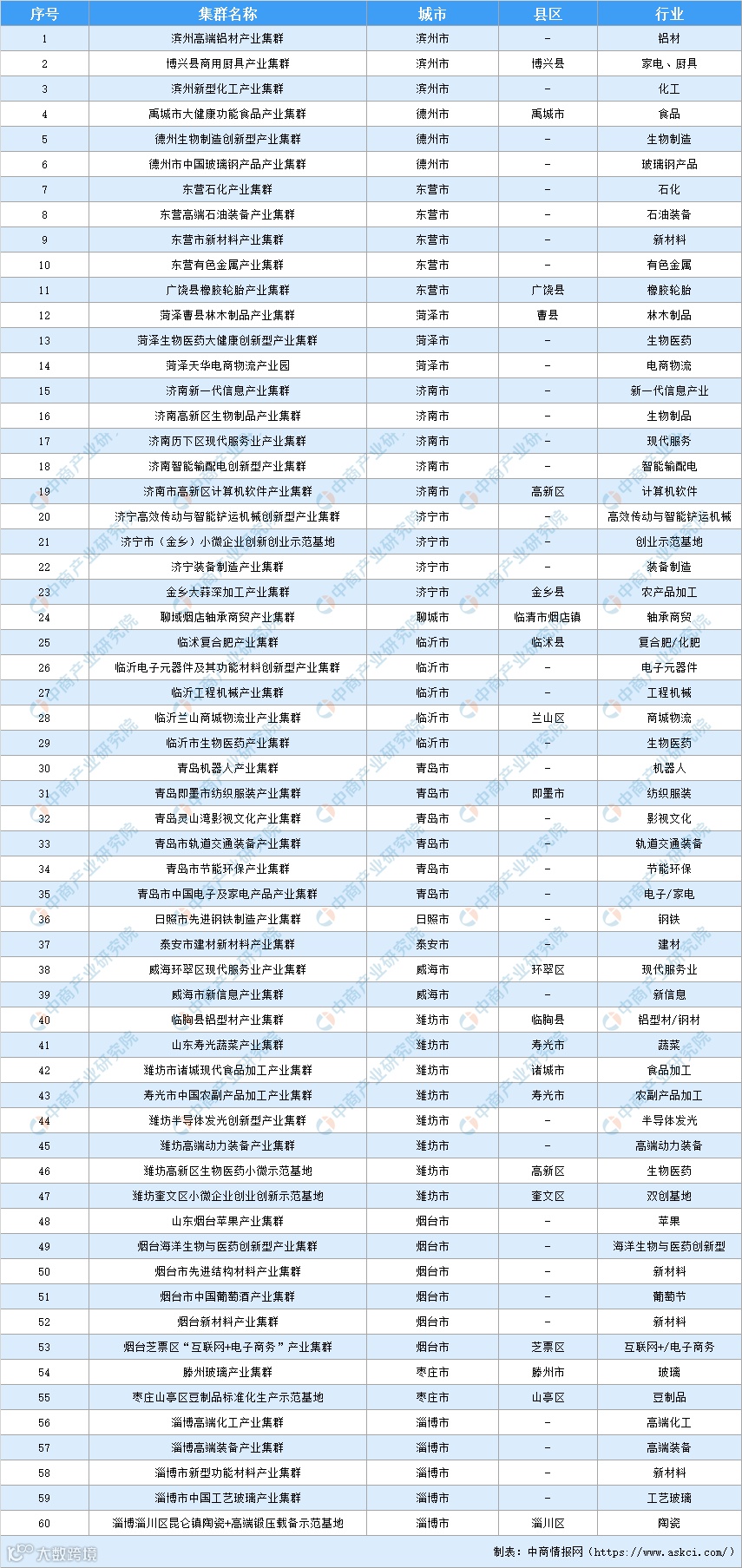 2020年山东省产业集群汇总一览表