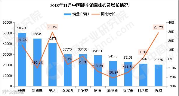 2018年11月,轿车销量排名前十依次为轩逸、新朗逸、捷达、桑塔纳、卡罗拉、速腾、新英朗、新宝来、科沃兹、思域。其中,11月轿车销量冠军为轩逸,销量达50591辆,同比增长14.9%。