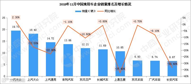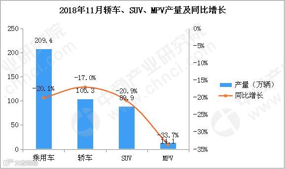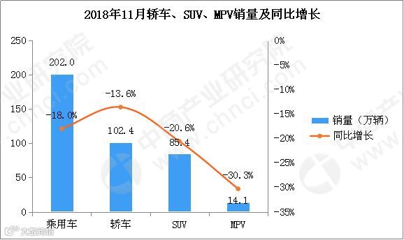 据数据显示,2018年11月乘用车产量为209.4万辆,环比增长5%,同比下滑20.1%;1-11月累计产量为2105.7万辆,同比下滑3.1%。销量方面,11月乘用车销量202万辆,环比增长3.4%,同比下滑18%;1-11月累计销量为2015.2万辆,同比下滑4%。