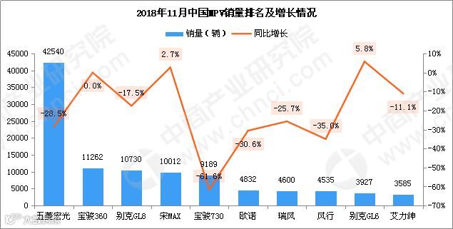 2018年11月,MPV销量排名前十依次为五菱宏光、宝骏360、别克GL8、宋MAX、宝骏730、欧诺、瑞风、风行、别克GL6、艾力绅。其中,11月MPV销量第一为五菱宏光,销量达42540辆。