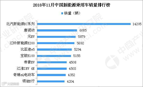2018年11月,新能源乘用车销量第一的车型为北汽新能源EC系列,销量达14205辆,同比下滑28.8%。前十排名车型依次为北汽新能源EC系列、唐混动、元EV、江铃新能源E200、比亚迪e5、宝骏E100、帝豪EV、江淮IEV6E、奇瑞eQ电动车、领途E行。其中,唐混动、比亚迪e5、宝骏E100同比涨幅超100%。