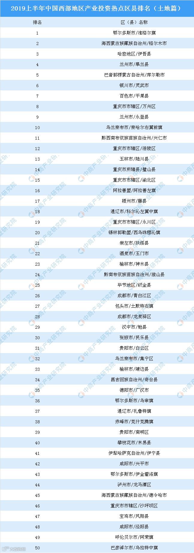 就西部地区各省份来看:为响应国家号召,各省也纷纷出台新政促进工业用地市场健康稳定发展。今年年初,重庆市出台《关于印发进一步支持实体经济企业健康发展若干政策措施的通知》,“通知”提出在经国家或市政府认可的工业园区范围内,属于智能产业或战略性新兴产业、用地集约的制造业项目,以及各区县以园区国有平台公司取得土地使用权建设的标准厂房项目等,土地出让底价可按所在地土地等别对应工业用地最低价格标准的70%执行。推行弹性年期出让、长期租赁、租让结合、先租后让等方式供应工业用地。当然,作为西部地区工业用地出让面积第一的鄂尔多斯市准格尔旗也不例外,也出台了《鄂尔多斯市土地利用总体规划(2006—2020年)》、《关于立即整改存在问题进一步加强土地管理的通知》等一系列相关政策。正是政策等多种促进因素影响下,使得鄂尔多斯市工业用地市场健康发展,也吸引众多企业前来投资。以下是2019上半年中国西部地区产业投资热点区(县)详细排名情况: