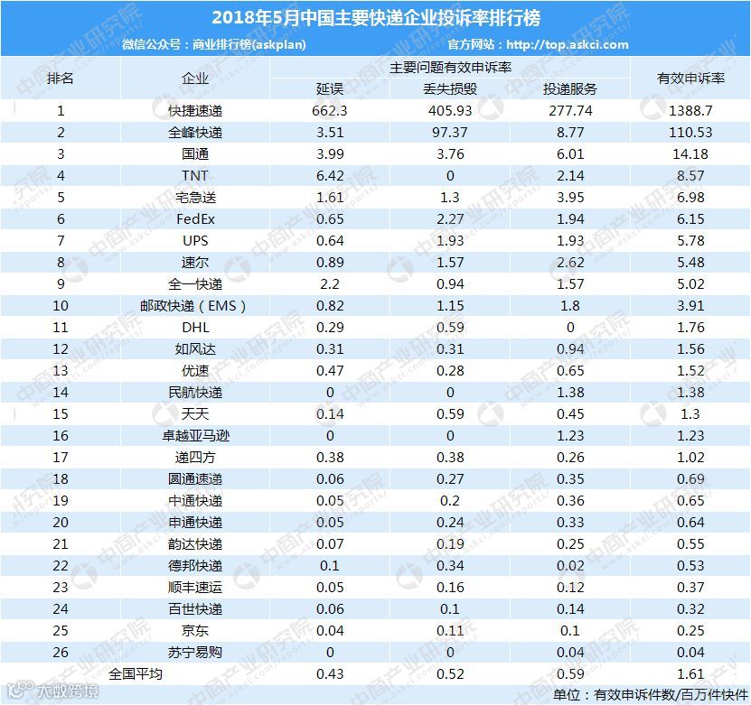 其中,5月快捷速递有效申诉率最高达1388.7,以下为具体排名: