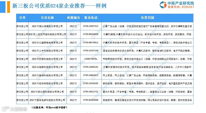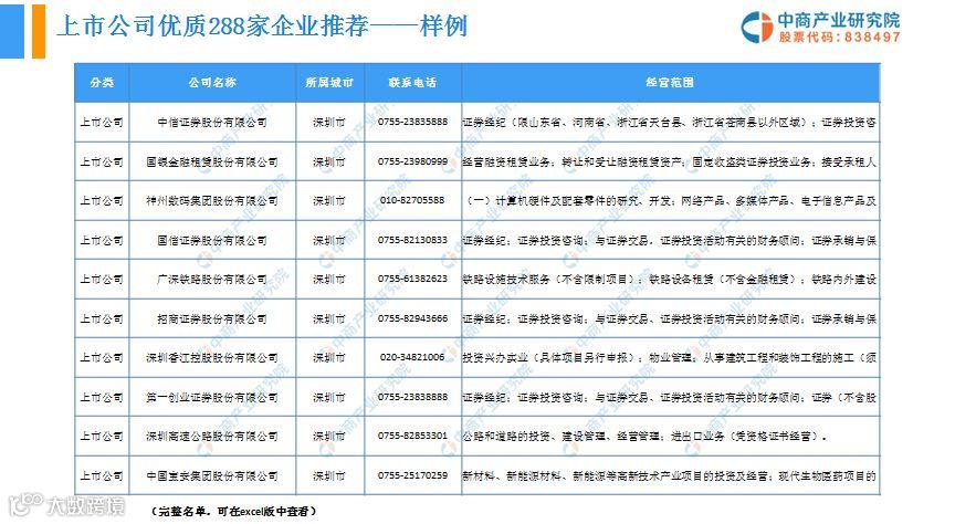 2、深圳市上市公司288家、新三板824家企业经营数据、联系方式及经营范围。