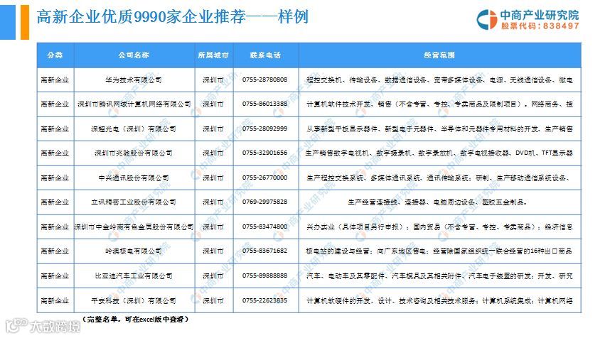 4、深圳市最新最全高新企业9990家联系方式、经营范围。