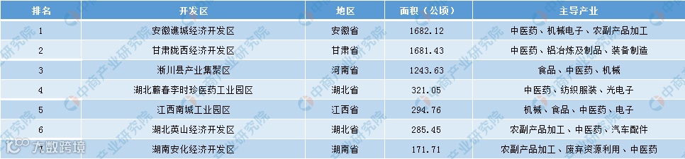 具体来看,位于安徽省的安徽谯城经济开发区面积最大,达1682.12公顷,主导产业包括中医药、机械电子、农副产品加工。其次为甘肃省的甘肃陇西经济开发区、河南省的淅川县产业集聚区、湖北省的湖北蕲春李时珍医药工业园区以及江西省的江西南城工业园区,以上开发区面积排名全国前五。