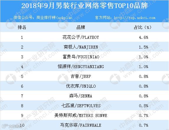 从男装行业网络零售情况来看,2018年9月男装行业网络零售总额达121.5亿元,同比增长52.4%。从品牌来看,9月男装行业网络零售TOP10品牌分别是:花花公子、南极人、富贵鸟、恒源祥、吉普、优衣库、森马、七匹狼、美特斯邦威、马克华菲。其中,花花公子品牌男装最受男士们青睐,其市场份额为4.6%,位列榜首。