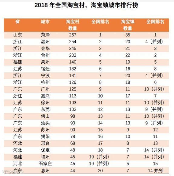 从淘宝村城市分布来看:山东菏泽以267个淘宝村位列全国淘宝村数量第一;其次为浙江温州,淘宝村数量为254个;浙江金华则排名第三,淘宝村数量达245个。从淘宝镇来看,山东菏泽仍然位列第一,淘宝镇数量达35个,浙江台州则位列第二,达22个;浙江金华以21个排名第三,浙江温州和宁波则以20个并列第四。以下是2018年全国淘宝村、淘宝镇城市排名详细情况: