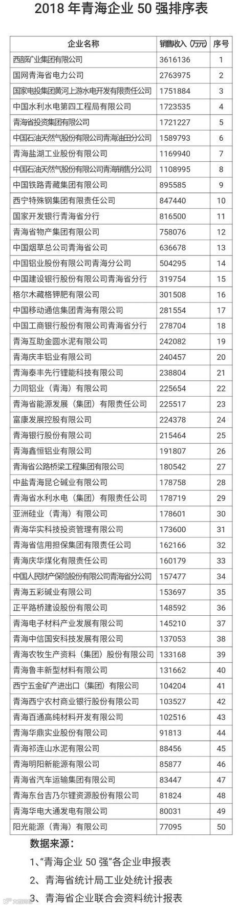 日前,2018年青海省企业50强榜单出炉。此榜单由青海省经济和信息化委员会、青海省统计局、青海省企业联合会、青海省企业家协会联合组织审定。