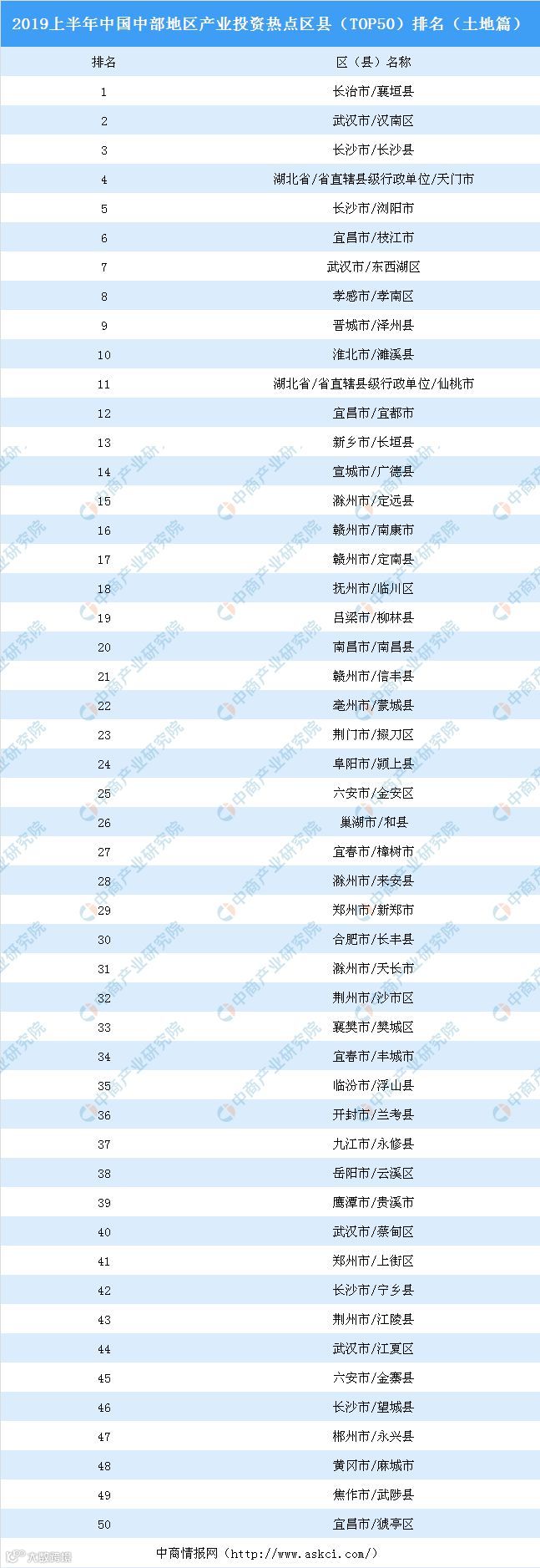 近年来,中部地区积极承接产业转移,引进高端项目,培育龙头企业,加快推动新旧动能转换,新兴产业快速成长。以江西为例,航空、VR、数字经济、物联网等一批新兴产业加速集聚,潜力型产业正加速向支柱型产业成长;湖南先后引进一大批优质产业项目,带动了汽车及零部件、电子信息、生物医药等新兴产业的集群发展。当前,中部地区发展进入了转型升级、提质增效的新阶段。不断增强中部地区综合实力和竞争力,奋力开创中部地区崛起新局面,必将为中国经济发展提供源源不断的动力。中部地区崛起势头正劲,中部地区发展大有可为,中部地区也因此吸引了众多企业前来投资,工业地产市场一片热火。以下是2019上半年中国中部地区产业投资热点区县TOP50详细排名情况: