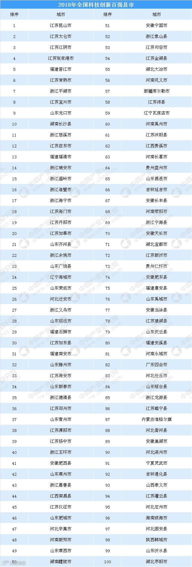 月8日,2018年中国中小城市科学发展指数研究报告出炉,报告发布了2018年全国科技创新百强县市。在科技创新百强县市中,东部地区占69席,中部占21席,西部和东北各占6席和4席。入围城市最多的省份是江苏、山东和浙江,各有24个、16个和14个县市入围。