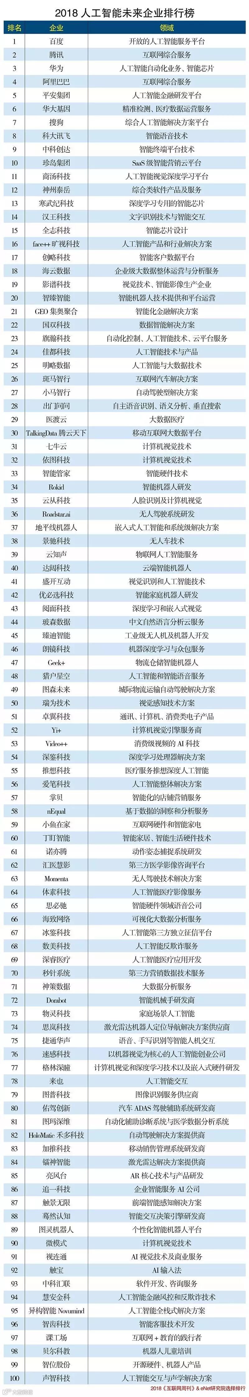 据最新的数据显示,2018年中国人工智能未来企业排行榜出炉。百度以排名第一的姿势领跑中国人工智能企业,位于第二的是腾讯,腾讯在人工智能的研发和资金投入付出了大量的心血,以大数据为基础,因此它的领域在互联网综合服务方面,得以它的大数据平台应用为优势。华为排名第三,据外媒报道,华为在2017年全球最具创新力企业排行中,排名第20。华为在人工智能自动化业务方面、以及智能芯片来看在中国都处于领先地位,这和腾讯、百度的人工智能依托优势有很大区别的。阿里巴巴排名第四也是在互联网综合服务方面,相较于腾讯而言,在大数据应用方面有所弱势。