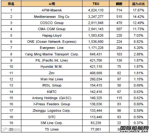 Alphaliner最新运力数据显示,全球班轮公司运力100强中排名前三的分别是马士基航运、地中海航运和中远海运集运。第四名到第十名依次为:达飞轮船、赫伯罗特、日本神运、长荣海运、阳明海运、太平船务和现代商船,全球班轮公司运力排名20的公司总运力为2015.63万TEU,占全球集装箱总运力的89.51%。