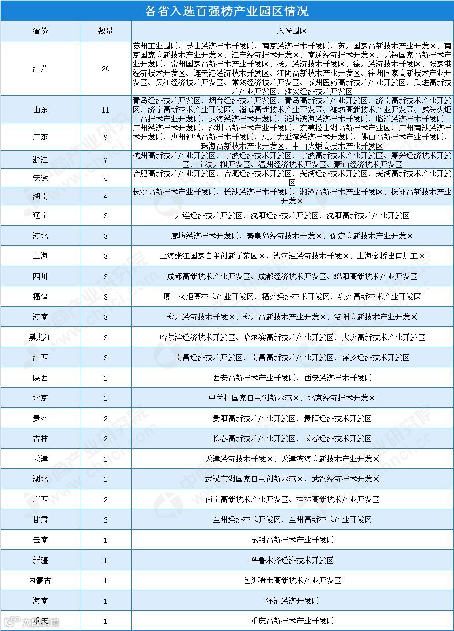 在2018年各省入选百强榜产业园区情况中,数据显示,江苏入选产业园数量位居榜首,数量为20家;其次为山东,产业园数量为11家;排名第三的是广东,产业园数量为9家。