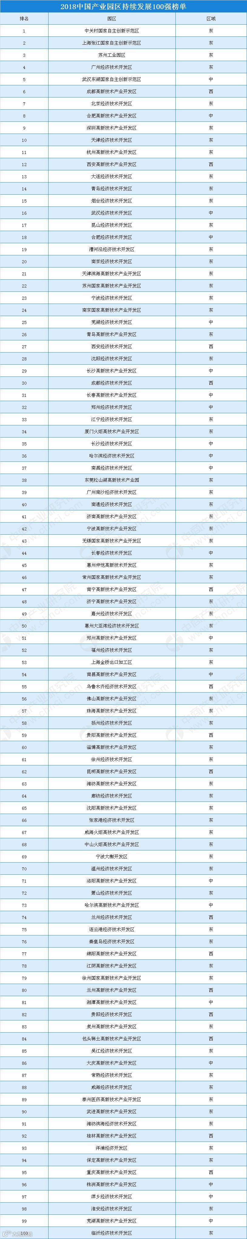 在2018中国产业园区持续发展100强榜单中,排名前十的产业园区为中关村国家自主创新示范区、上海张江国家自主创新示范区、苏州工业园区、广州经济技术开发区、武汉东湖国家自主创新示范区、成都高新技术产业开发区、北京经济技术开发区、合肥高新技术产业开发区、深圳高新技术产业开发区、天津经济技术开发区。