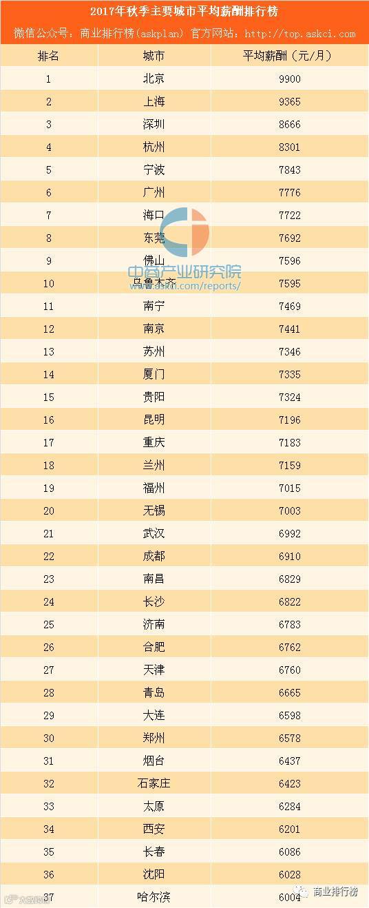 10月18日,智联招聘发布了一份针对白领求职的调查报告《2017年秋季中国雇主需求与白领人才供给报告》,报告显示:今年秋季,全国37个主要城市的白领平均招聘月薪为7599元,环比上升3%。宁波平均薪酬超越广州,天津薪酬掉队,重庆跻身七千阵营。