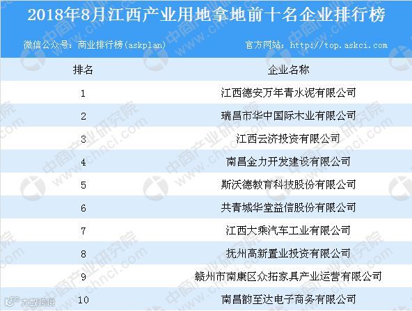 据专业的产业拿地策划规划咨询机构中商产业研究院产业地产情报库监测数据显示,2018年8月,江西产业用地拿地企业前10名分别为:江西德安万年青水泥有限公司、瑞昌市华中国际木业有限公司、江西云济投资有限公司、南昌金力开发建设有限公司、斯沃德教育科技股份有限公司、共青城华堂益信股份有限公司、江西大乘汽车工业有限公司、抚州高新置业投资有限公司、赣州市南康区众拓家具产业运营有限公司和南昌韵至达电子商务有限公司;其中前10名企业用地拿地总计面积约273.44公顷。