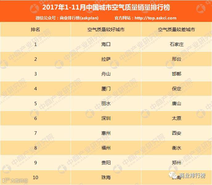 11月,74个城市空气质量相对较好的前10位(从第1名到第10名)城市依次是:舟山、海口、拉萨、厦门、福州、大连、张家口、台州、丽水、深圳和惠州市(并列)。1–11月,前10位城市依次是:海口、拉萨、舟山、厦门、丽水、深圳、惠州、福州、贵阳和珠海市。