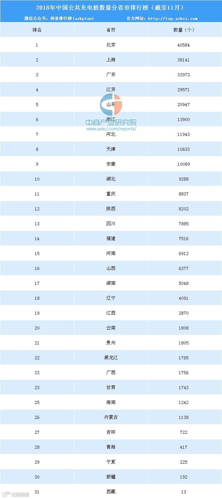 截至11月,省级行政区域内所拥有的公共类充电桩数量前十的分别为北京、上海、广东、江苏、山东、浙江、河北、天津、安徽、湖北。