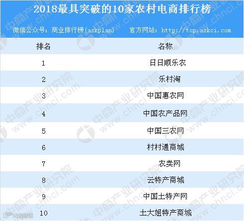 近日,2018最具突破的10家农村电商排行榜出炉。据榜单显示:2018最具突破的10家农村电商分别是:日日顺乐农、乐村淘、中国惠农网、中国农产品网、中国三农网、村村通商城、农卖网、云特产商城、中国土特产网以及土大姐特产商城。其中,日日顺乐农位列榜首。
