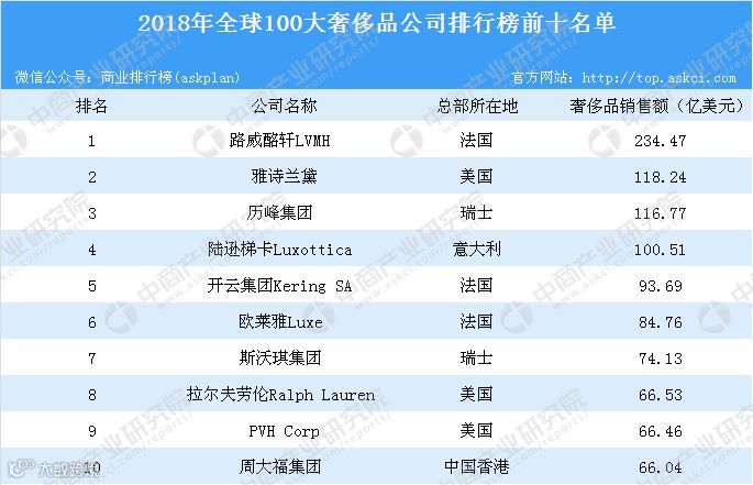 近日,2018奢侈品全球力量报告(Global Powers ofLuxury Goods2018)发布,同时公布了2018年度全球100大奢侈品公司排行榜。据榜单显示:法国路威酩轩集团(LVMH)位列2018年度全球100大奢侈品公司排行榜榜首,而美国雅诗兰黛集团则超过瑞士历峰集团跃居第二位。进入前十名的还包括陆逊梯卡、开云、欧莱雅Luxe、斯沃琪集团、拉尔夫劳伦、PVH和周大福。