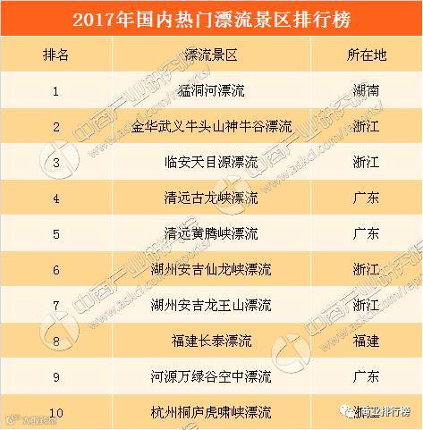 此外,金华武义牛头山神牛谷漂流、临安天目源漂流、清远古龙峡漂流、清远黄腾峡漂流、湖州安吉仙龙峡漂流、湖州安吉龙王山漂流、福建长泰漂流、河源万绿谷空中漂流、杭州桐庐虎啸峡漂流也入选了国内人气最旺的十大漂流景区夏国内水上乐园和漂流景区人气榜单前10名。