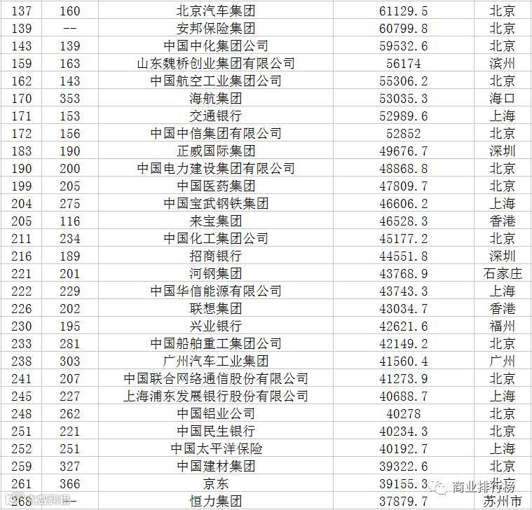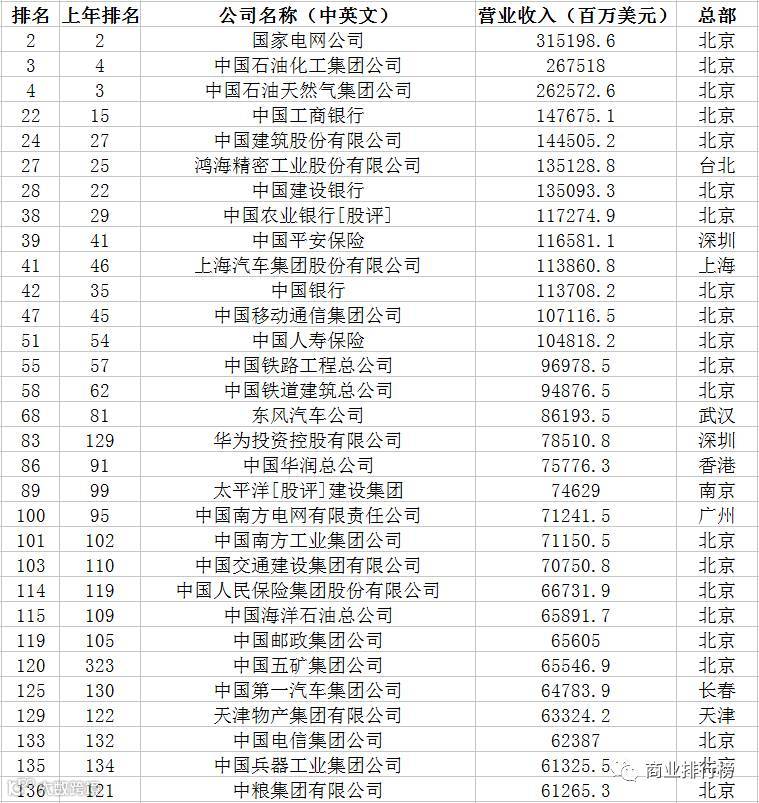 中国上榜公司数量连续第十四年增长,今年达到了115家。其中中国大陆(含香港在内,不包括台湾地区)为109家企业。10家中国公司首次上榜,它们是:安邦保险集团、恒力集团、阳光金控、阿里巴巴、碧桂园、腾讯、苏宁云商、厦门建发集团、国贸控股集团和新疆广汇。新上榜公司最多的行业是贸易(3家),其次是两家来自互联网服务和零售的公司——阿里巴巴和腾讯。碧桂园是唯一新上榜的房地产企业。