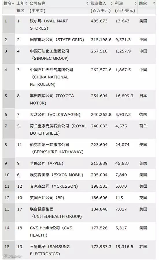 7月20日,新的《财富》世界500强排行榜出炉,沃尔玛连续四年排名第一位,前三阵营中的其它两家为中国公司——国家电网和中石化。中石油列第四位。