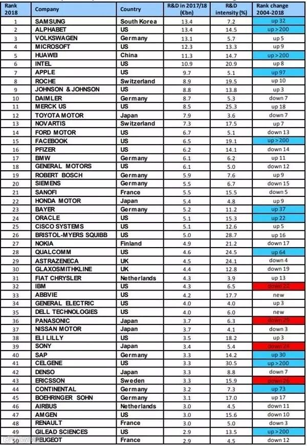 近日,欧盟委员会公布了《2018年欧盟工业研发投资排名》,这个排名主要是对全球46个国家和地区的2500家主要企业2017会计年度研发投入进行的调查。
