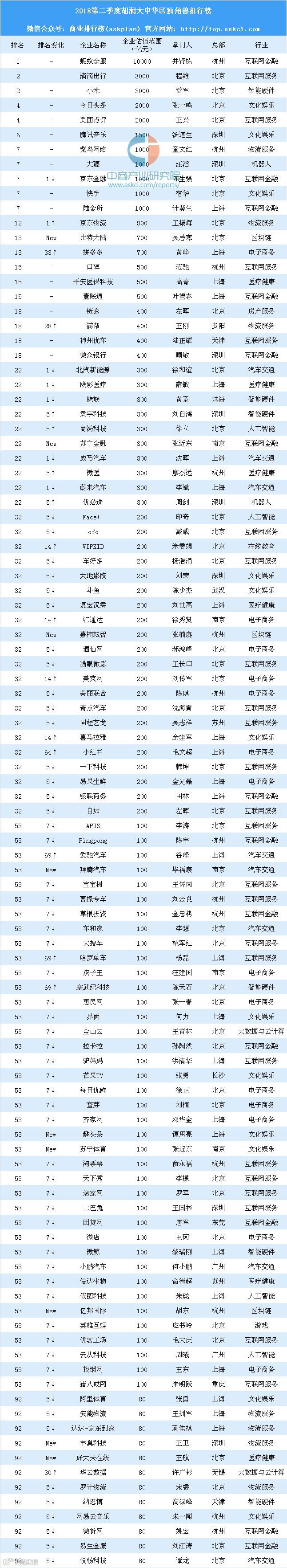 排名前十的企业与上一期一样。蚂蚁金服的估值从上一期的4000亿上升到1万亿,位列第一,滴滴出行和小米保持3000亿的估值并列第二;美团点评和今日头条保持2000亿的估值并列第四;腾讯音乐保持1500亿的估值排名第六;京东金融、菜鸟网络、陆金所、快手和大疆以1000亿的估值并列第七。6月8日,蚂蚁金服宣布新一轮融资,融资总金额140亿美元。