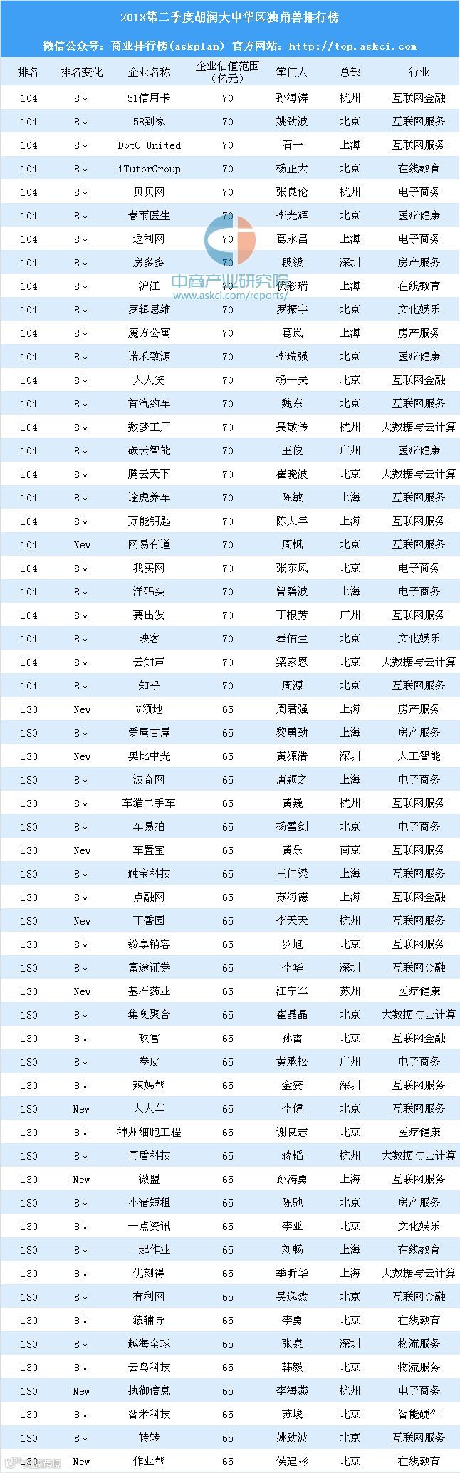注:企业估值范围前十名均代表相应的数字以上,如1000亿代表1000亿以上;800亿代表估值范围750亿~850亿;700亿代表估值范围650亿~750亿;500亿代表估值范围450亿~550亿;400亿代表估值范围350亿~450亿;300亿代表估值范围250亿~350亿;200亿代表估值范围150亿~250亿;100亿代表估值范围100亿~150亿;80亿代表估值范围80亿~100亿;70亿代表估值范围70亿~80亿;65亿代表估值范围65亿~70亿。