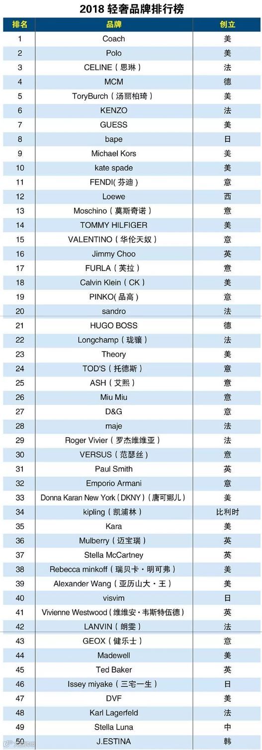 据2018年轻奢侈品牌排行榜显示:进入2018年轻奢侈品牌排行榜前十品牌分别是: Coach、Polo、CELINE (思琳)、MCM、ToryBurch ( 汤丽柏琦)、KENZO、GUESS、bape、Michael Kors和kate spade。其中,Coach位列榜首。值得提出的是,前十品牌中,美国占了六席。
