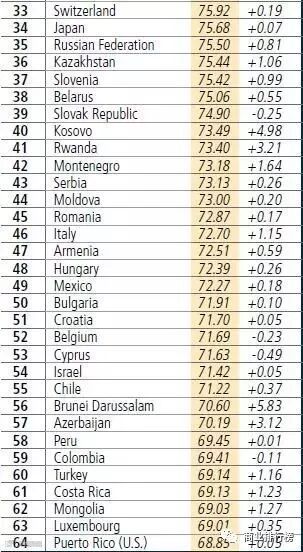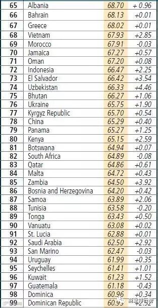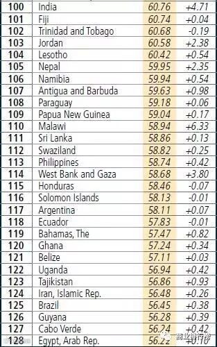 全球营商环境排名前十的国家(地区)依次是:新西兰、新加坡、丹麦、韩国、中国香港、美国、英国、挪威、格鲁吉亚、瑞典。中国台湾地区以80.07分排名第15,名次高于中国大陆(78)、日本(34)、德国(20)、法国(31)、俄罗斯(35)等世界主要经济体。值得注意的是,本次排名的大赢家当属印度,进步了30名,也是此次排名中唯一一个取得重大进步的大国。