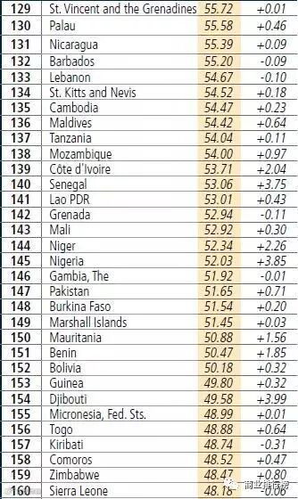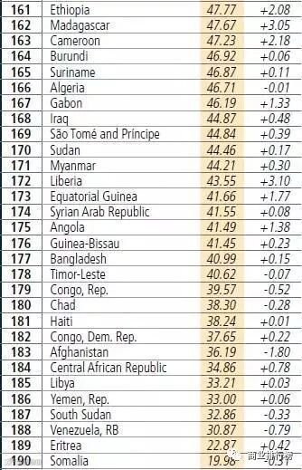 排名最后五位的国家(地区)分别是:索马里(190位)、厄立特里亚(189位)、委内瑞拉(188位)、南苏丹(187位)、也门(186位)。