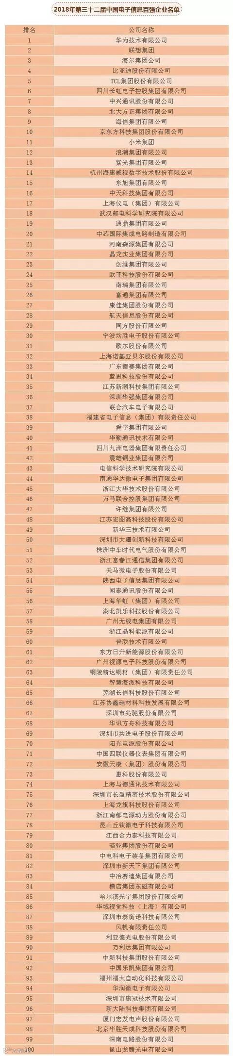 7月31日,2018年中国电子信息百强企业榜单发布。据榜单显示: 进入榜单的前十企业分别是:华为技术有限公司、联想集团、海尔集团公司、比亚迪股份有限公司、TCL集团股份有限公司、四川长虹电子控股集团有限公司、中兴通讯股份有限公司、北大方正集团有限公司、海信集团有限公司以及京东方科技集团股份有限公司。