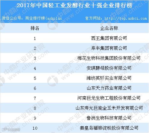 近日,2017年中国轻工业发酵行业十强企业排行榜出炉。据榜单显示:2017年中国轻工业发酵行业十强企业分别为:西王集团有限公司、阜丰集团有限公司、梅花生物科技集团股份有限公司、安琪酵母股份有限公司、潍坊英轩实业有限公司、山东天力药业有限公司、河南巨龙生物工程股份有限公司、山东寿光巨能金玉米开发有限公司、鲁洲生物科技有限公司和秦皇岛骊骅淀粉股份有限公司。