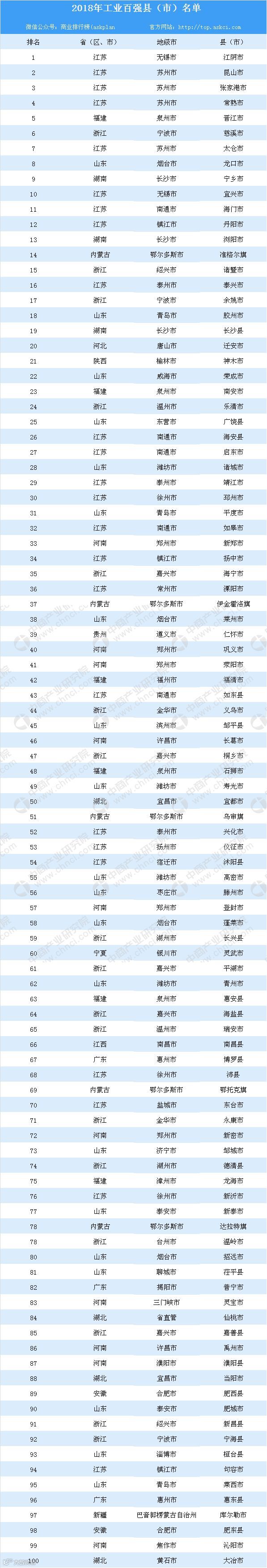从数量分布看,东、中部省份继续保持明显优势,入围县(市)数量分别为71和20个。苏鲁浙等经济大省继续领跑,江苏24个,占全省县(市)数量的比重高达58%,山东、浙江分别为20个、17个,占全省县(市)数量比重均在25%以上;河南10个,福建6个,湖北4个,湖南、广东各3个, 安徽2个,河北、江西各1个。 西部省份入围9个, 其中内蒙古5个,陕西、贵州、宁夏、新疆各1个。以下是2018年工业百强县(市)榜单详细排名情况: