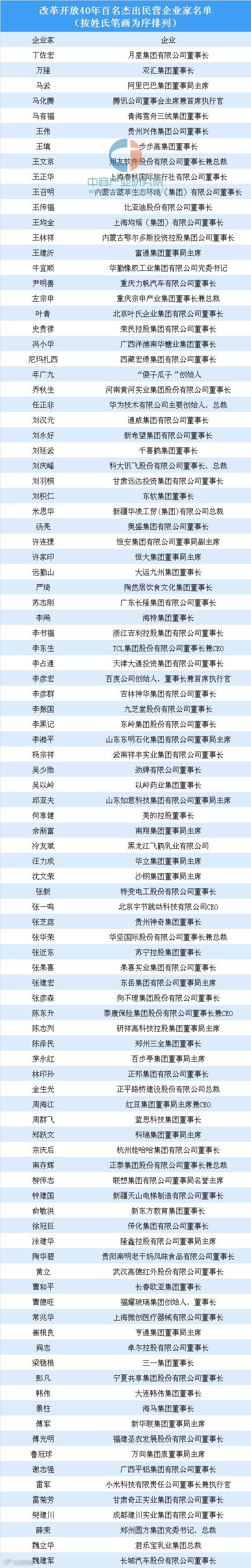 “改革开放40年百名杰出民营企业家”名单中,BAT三大创始人:阿里巴巴的马云、腾讯的马化腾以及百度的李彦宏都在榜,另外更有很多杰出的民营企业家,具体名单如下: