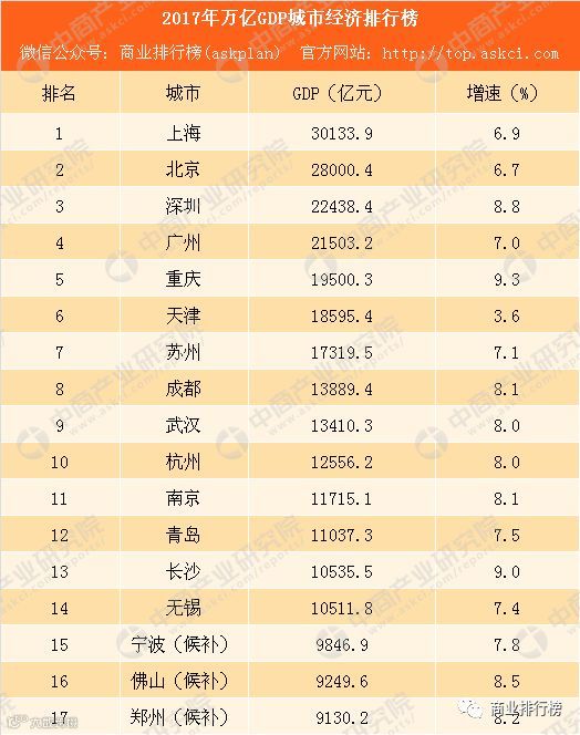 2017年,全国297个地级以上城市中GDP超万亿城市已达14个,分别是上海、北京、深圳、广州、重庆、天津、苏州、成都、武汉、杭州、南京、青岛、长沙和无锡;其中长沙和无锡两市在2017年超过万亿。