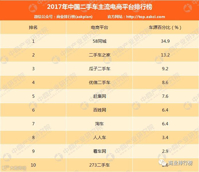 二手车店商平台方面,2017年公平价大数据中心统计全网36家主流电商平台去重后车源总数1644万辆。排名依次是58同城、二手车之家、瓜子二手车、优信二手车、赶集网、百姓网、淘车、人人车、看车网、273二手车。值得注意的是,58同城领先优势明显,长期霸占第一宝座,车源占比高达34.91%。三大电商交易平台瓜子二手车、优信二手车、人人车,市场份额均比上一年度有明显增长。