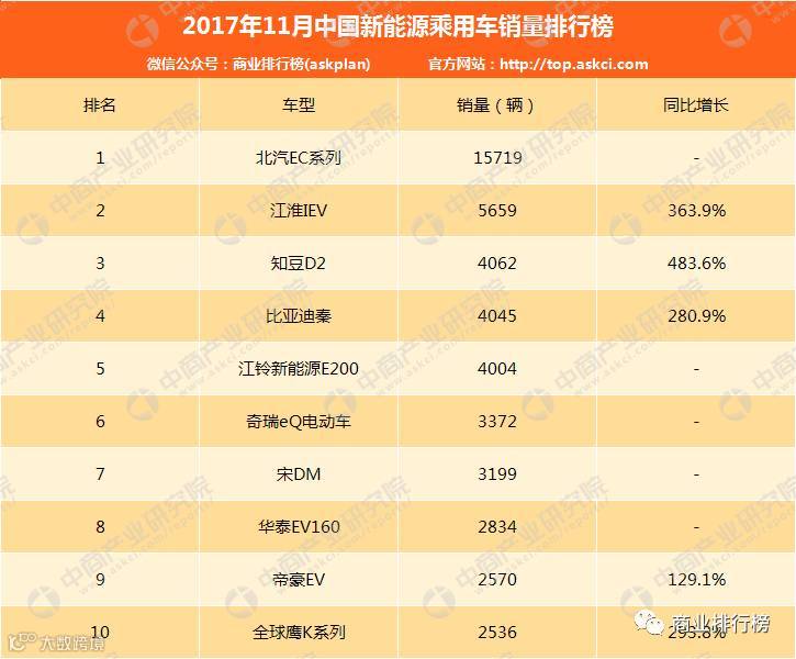 2017年11月中国新能源乘用车销量排名第一的车型为北汽新能源EC系列,11月销量为15719辆,1-11月累计销量达64910辆。以下为具体排名:
