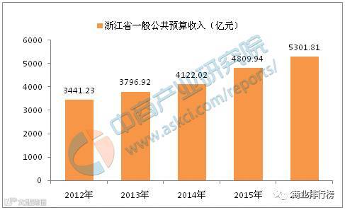 2016年,浙江省一般公共预算收入为5301.81亿元,同比增长10.29%。2016年,浙江省委省政府全面落实创新驱动发展战略,推动大众创业、万众创新,着力补齐科技创新等六大短板,新产业、新技术、新产品、新业态、新模式和新服务加快成长,有力推动了经济增长,增加了浙江省财政收入。