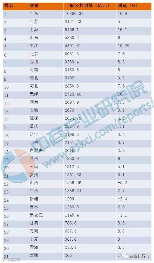 2016年全国各省一般公共预算排名