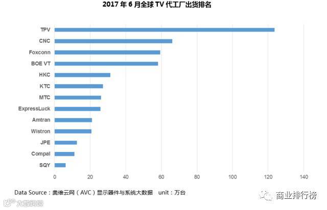 据数据统计显示,2017年6月全球13大TV代工厂出货488.8万台,同比下滑10.4%,环比增长3.4%。