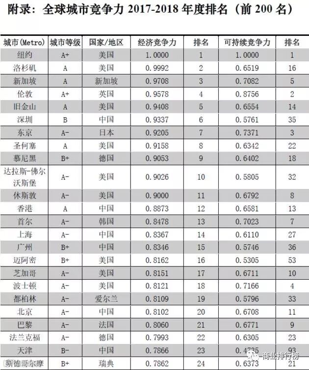 日前,中国社会科学院与联合国人居署共同发布了《全球城市竞争力报告2017-2018》。报告中分别对全球城市的经济竞争力和可持续竞争力进行了排名。据排名显示,全球城市竞争力排名纽约高居榜首,洛杉矶紧随其后,新加坡排名第三。其中,中国排名最高的城市是深圳,排名第六位。以下为具体排名:
