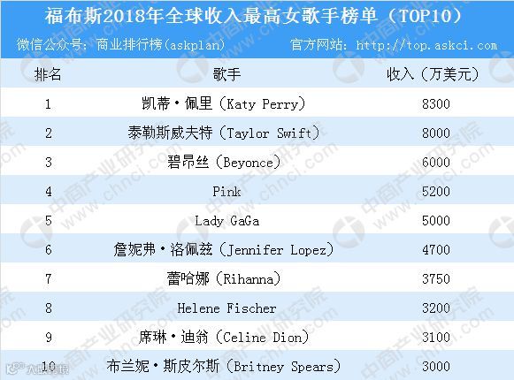 日前,福布斯公布了2018收入最高的女歌手,本次榜单前十名入门门槛为3000万美元,前十名收入共计50250万美元。排名前十名的歌手是:凯蒂·佩里(KatyPerry)、泰勒斯威夫特(TaylorSwift)、碧昂丝(Beyonce)、Pink、LadyGaGa、詹妮弗·洛佩兹(JenniferLopez)、蕾哈娜(Rihanna)、HeleneFischer、席琳·迪翁(CelineDion)与布兰妮·斯皮尔斯(BritneySpears)。