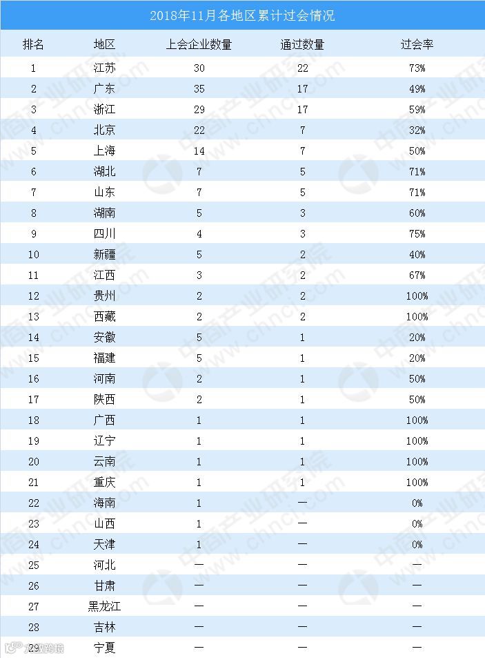 2018年是IPO的“小年”,特别是各中小投行的IPO项目,更是不景气,从各省份的IPO数量来看,也出现了新变化。截止2018年11月上会企业数量为186家。其中通过数量为102家。通过率为55%,低于2017年的76%。